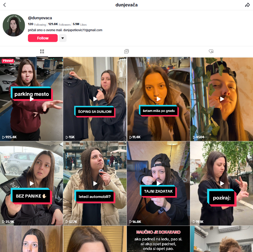 Dunja Petković, poznatija kao Dunjevača, TikTok kreatorka sa preko 121K pratilaca i 5M lajkova, publiku osvaja socijalno neprijatnim humorom, muzikom i stand-up formom. Njeni viralni klipovi kombinuju awkward situacije, neočekivane dijaloge i precizne poente. Pored skečeva, Dunjevača stvara duhovite pesme koje koristi u stand-up nastupima, ostvarujući živu interakciju sa publikom i gradeći autentičan, prepoznatljiv komičarski izraz koji spaja originalnost, humor i emotivnu preciznost.