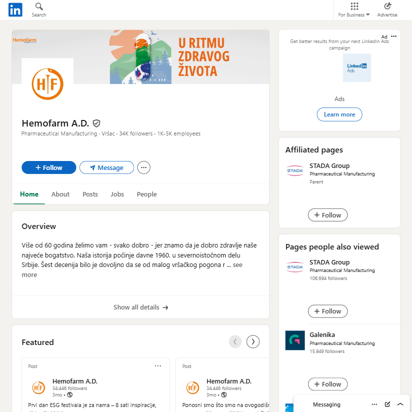 Profil kompanije Hemofarm jedan je od najrelevantnijih primera kvalitetne i promišljene korporativne komunikacije na LinkedIn-u u Srbiji. Kompanija sa više od šest decenija tradicije, osnovana 1960. u Vršcu i deo STADA grupe, koristi LinkedIn (34K pratilaca) za transparentno informisanje i dijalog sa stručnom i širom javnošću. Objave prate farmaceutsku industriju, održivi razvoj, brigu o zaposlenima, edukaciju mladih i društveno odgovorne inicijative, sa akcentom na ljude, timove i procese iza razvoja lekova. Profesionalnim nastupom gradi poverenje i jača reputaciju poslodavca, potvrđujući značaj LinkedIn-a kao kanala korporativne komunikacije.