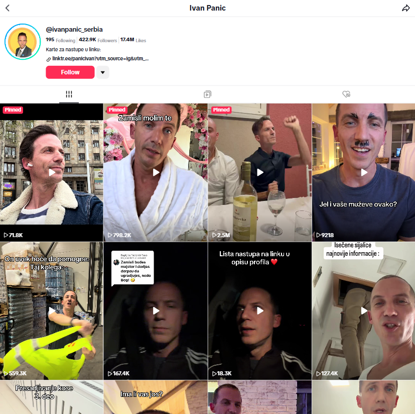 Ivan Panić, TikTok kreator sa preko 422K pratilaca, publiku osvaja autentičnim humorom i neposrednim pogledom na svakodnevicu. Njegovi spontani video-klipovi, od svadbi do rada na kruzerima, pretvaraju obične situacije u duhovite priče koje publika lako prepoznaje. Humor je iskren, topao i proistekao iz ličnih iskustava i susreta sa ljudima, što gradi snažnu lojalnost pratilaca. Pored TikToka, Ivan nastupa i stand-up predstavom „Veče sa Panićem“, spajajući digitalni uspeh sa živim nastupima i direktnom interakcijom sa publikom.