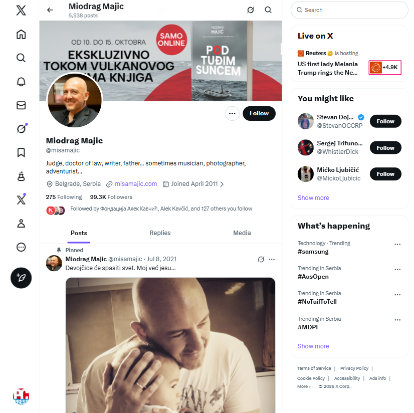 X nalog sudije Miodraga Majića, kojeg prati skoro 100K ljudi, jedan je od najprepoznatljivijih glasova pravničke struke u Srbiji. Kao sudija Apelacionog suda u Beogradu i doktor pravnih nauka, koristi platformu za precizno komentarisanje pitanja vladavine prava, funkcionisanja pravosuđa i institucionalnog okvira društva. Njegove objave se bave zakonima, nezavisnošću sudstva i javnim diskursom. Oprezan u komunikaciji, Majić jasno odvaja profesionalno delovanje od ličnih stavova. Njegov X profil pokazuje da stručan i kritički ton može imati snažan odjek, služeći za edukaciju i odbranu institucija.