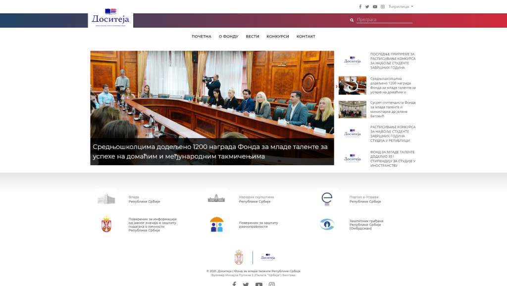 Fond za mlade talente, koji je Vlada Republike Srbije osnovala 2008. godine, od 2010. godine svoje nagrade i stipendije dodeljuje pod imenom “Dositeja”. Posvećen je permanentnoj brizi o talentima i finansijskoj podršci našim najuspešnijim srednjoškolcima i studentima. Kroz konkurse koje transparentno realizuje svake školske godine, Fond nagrađuje učenike srednjih škola za postignute uspehe na takmičenjima […]